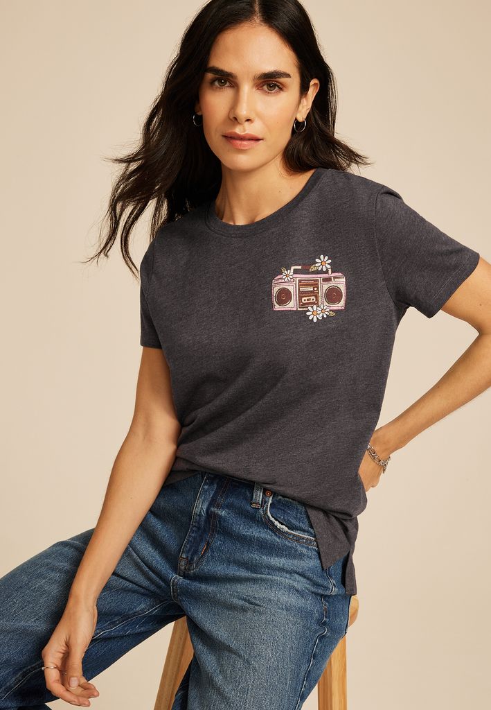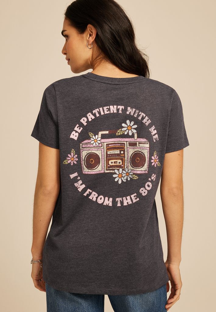- back graphic: large boombox with flowers and text reading “BE PATIENT WITH ME I’M FROM THE 80’s”