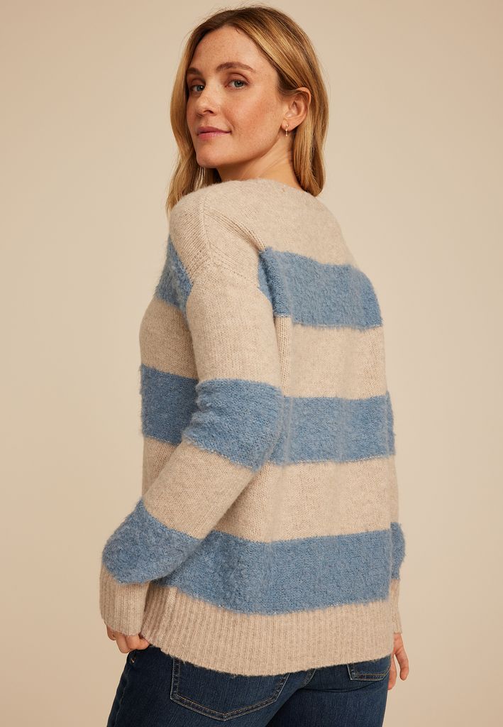 - striped pattern: oatmeal neutral base with light blue accent
