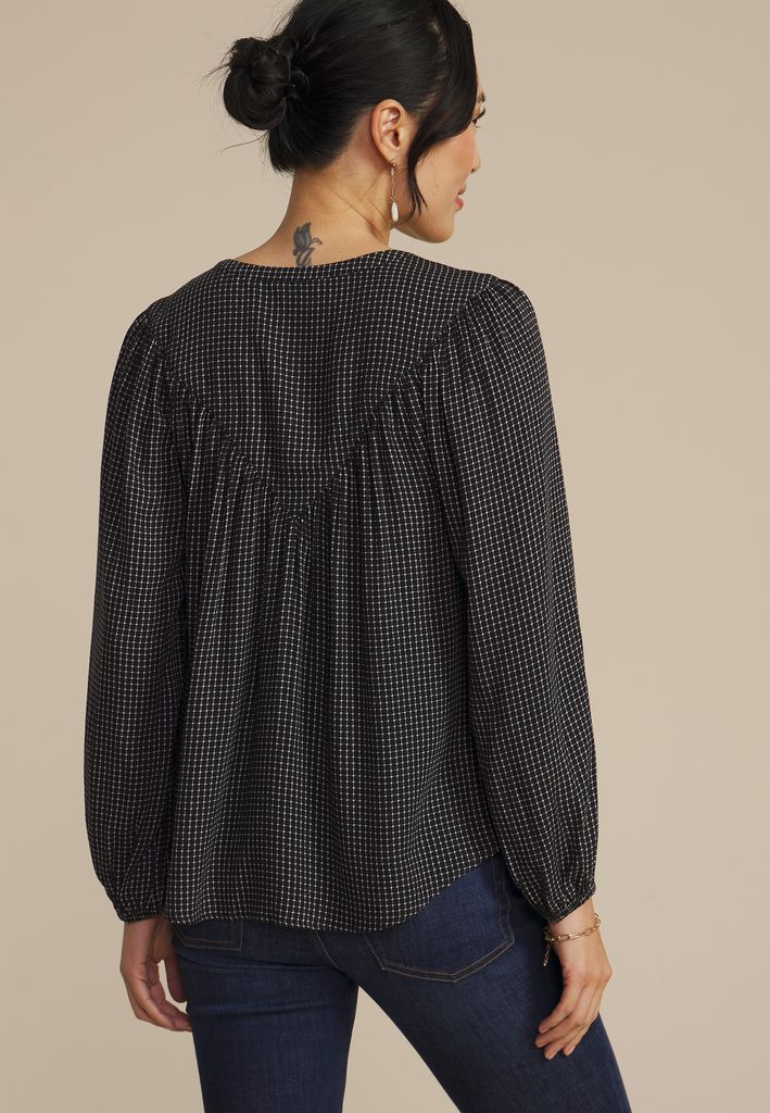Checkered Button Front Peasant Blouse