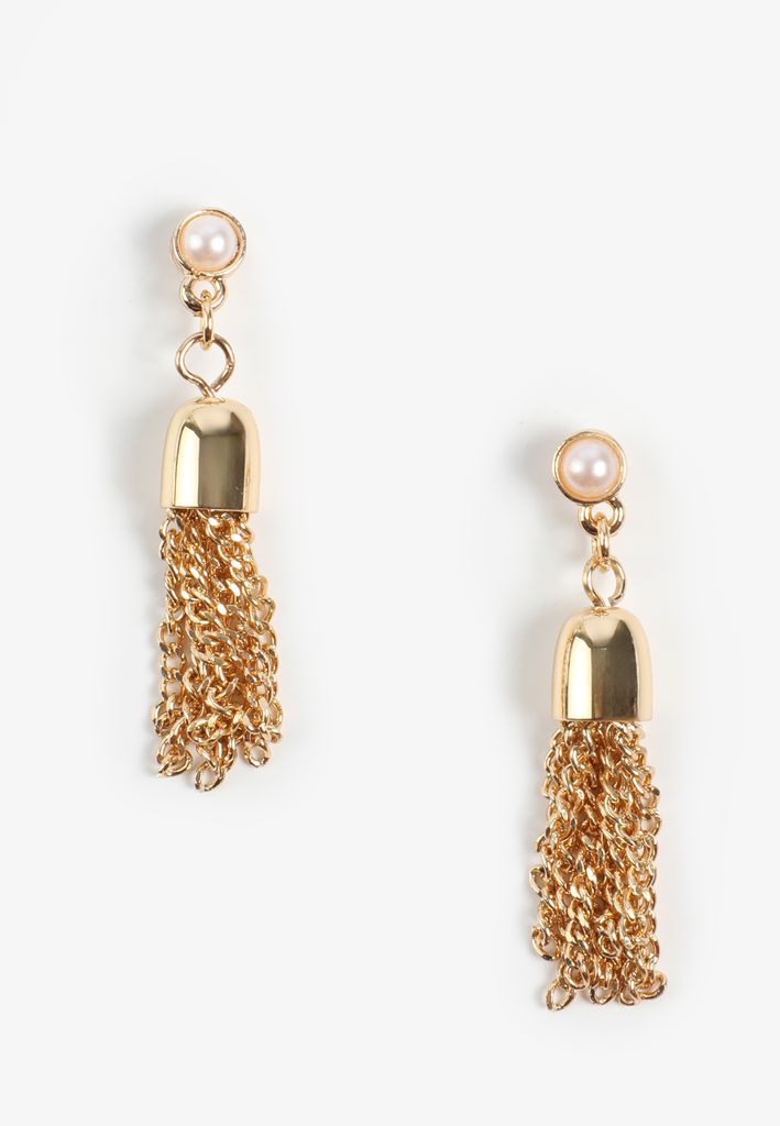 Faux Pearl And Gold Tassel Earrings