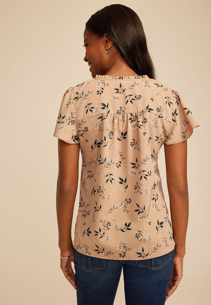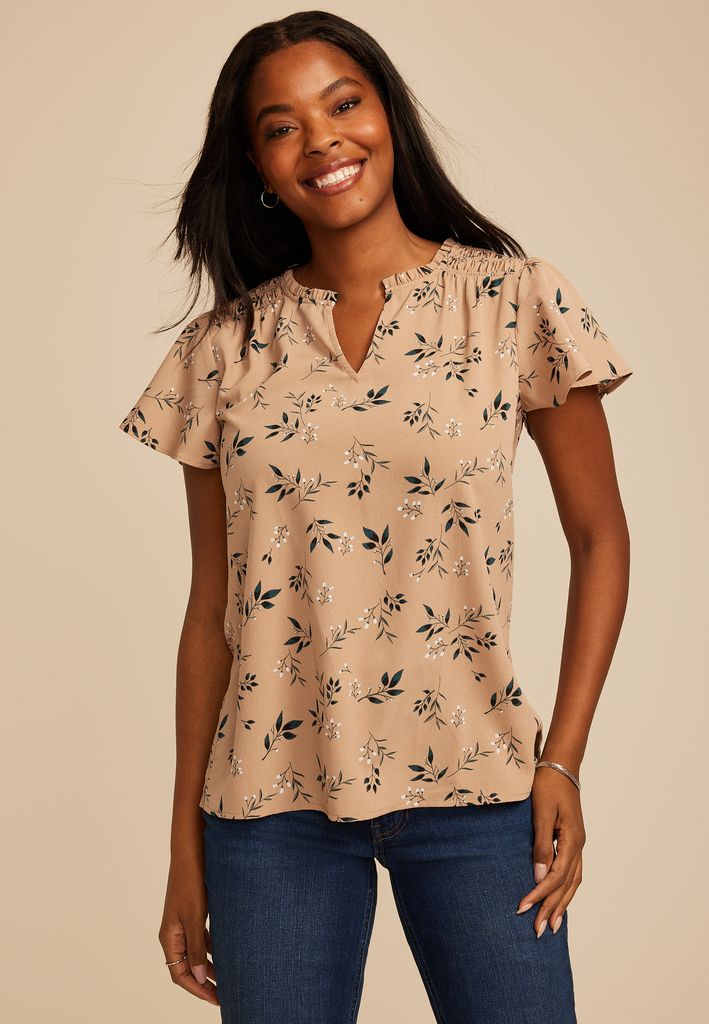 Breeze through your day in this Floral Smocked Shoulder Flutter Sleeve Blouse With its delicate leaf print and airy flutter sleeves, this top brings effortless elegance to any look. Smocked shoulders add a hint of texture, while the split V-neckline flatters with ease. Whether you’re dressing it up for the office or keeping it casual for brunch, this blouse is your go-to for polished comfort.