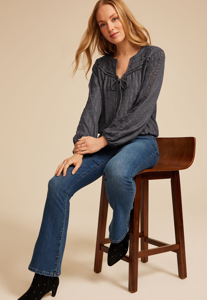 • decorative ladder stitch trim along the neckline, sleeves and upper back for added detail