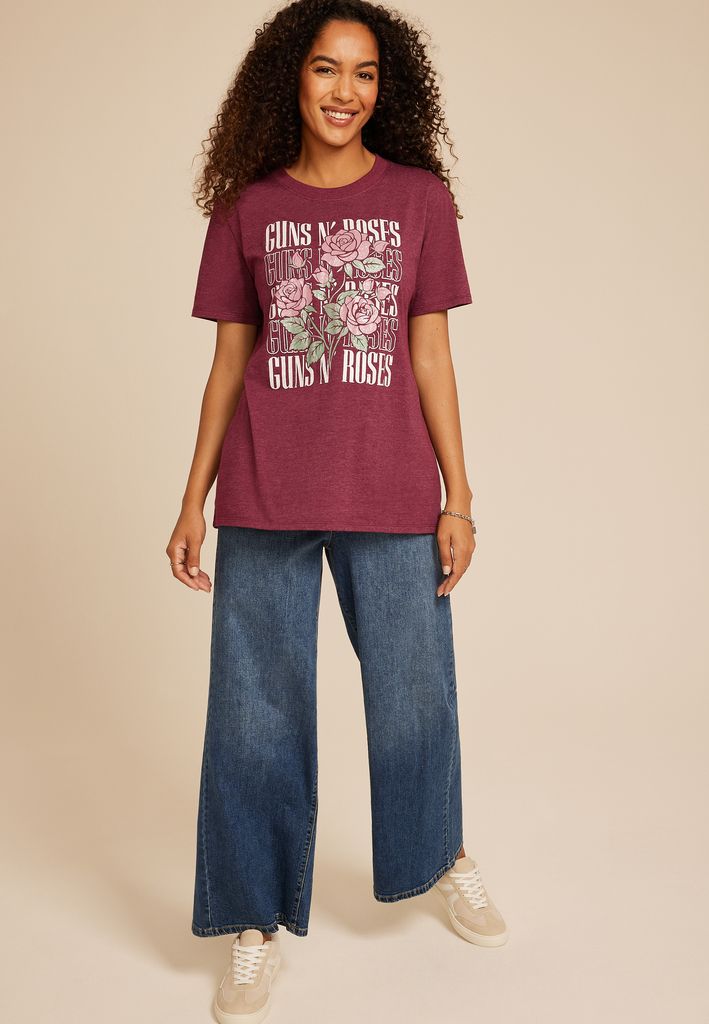 - licensed “GUNS N’ ROSES” glitter pink roses with green leaves layered over the text graphic