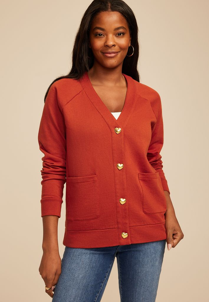 Fall in love with the little details. This Heart Button Front Cardigan brings effortless charm to your everyday look with its gleaming gold heart-shaped buttons and soft, structured knit. Designed with a relaxed silhouette and practical patch pockets, it’s the perfect blend of cozy and comfort. Whether layered over a crisp tee or paired with your favorite denim, this piece adds a touch of warmth to every outfit.