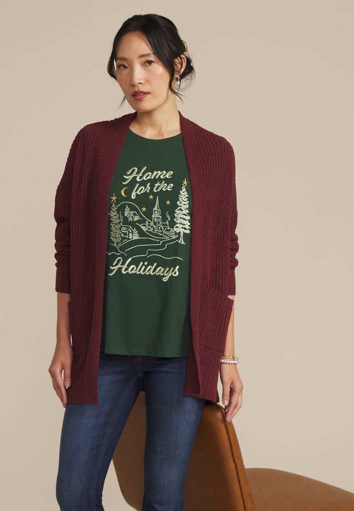 • intricate embroidery featuring “Home for the Holidays” text, snowy trees, and a village scene with metallic gold accents graphic