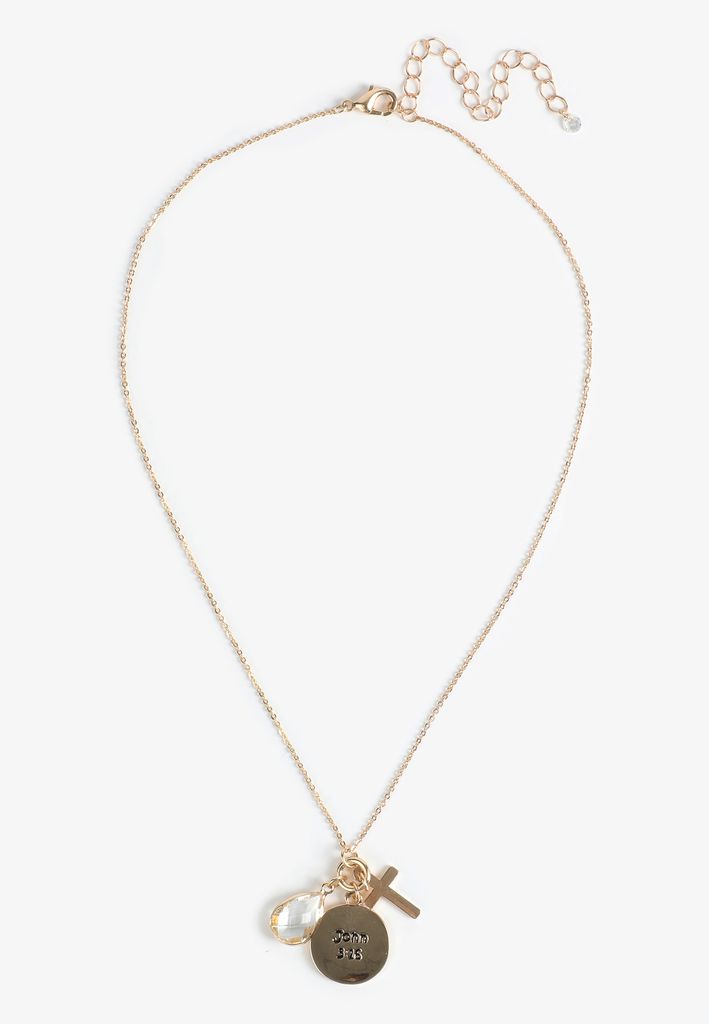 • charms include: a disc engraved with text John 3:16, clear faceted crystal and polished goldtone cross pendant