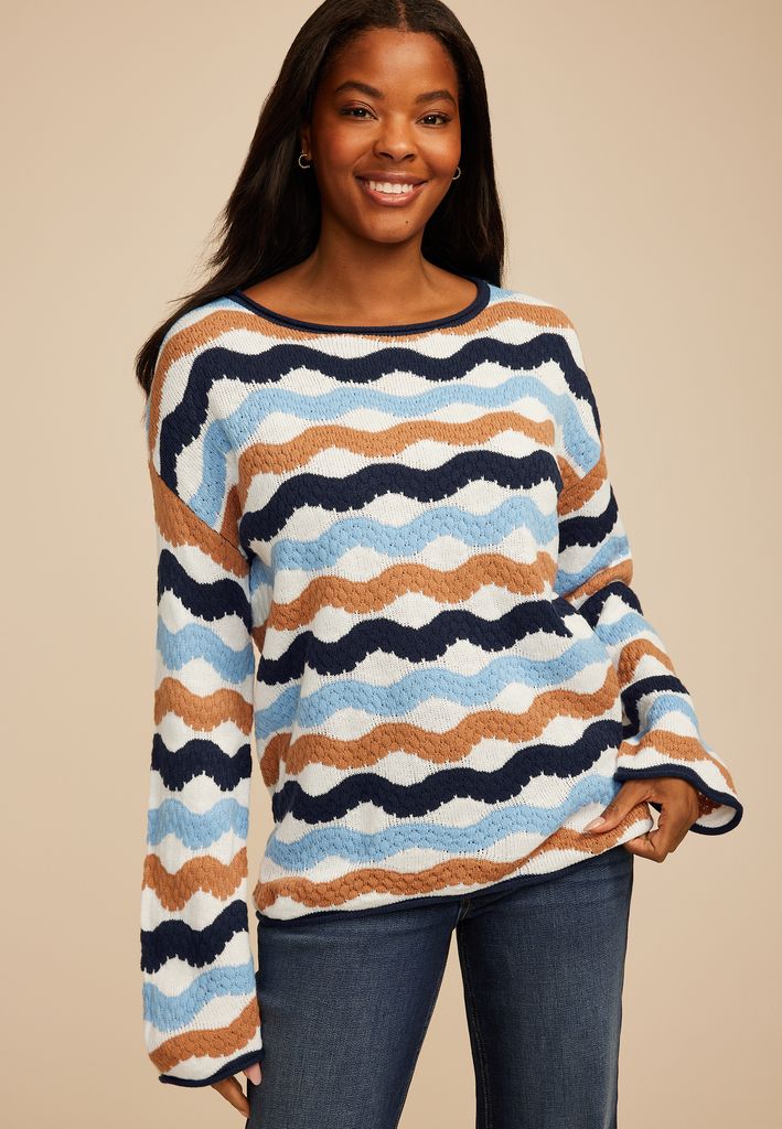 This sweater brings a breezy, feel‑good ease to your day. Soft wave stripes in calming blues and warm neutrals create an effortless, uplifting look. Its relaxed drape and cozy texture make it the piece you reach for when you want comfort that still feels fresh and full of charm. It adds a touch of laid‑back brightness to any moment, giving your everyday style a soft sense of movement and ease. Pair it with medium‑wash denim for an easy everyday look, layer a navy or camel coat to highlight the stripe colors, or slip into white sneakers for a clean casual vibe.