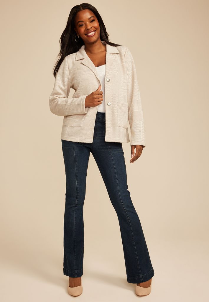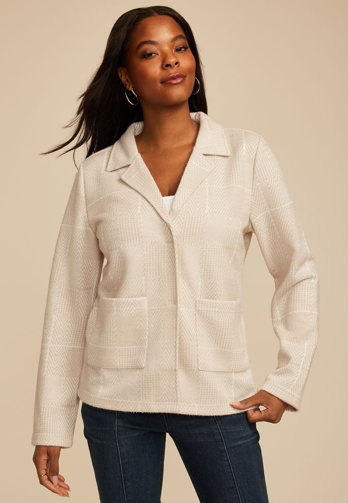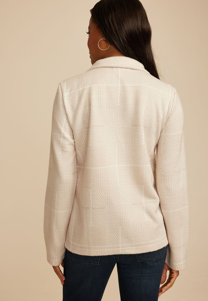 This blazer brings a soft refined presence into any closet. The ivory houndstooth pattern delivers classic heritage texture while maintaining a light modern ease. Its plush hand and relaxed shape create a quietly elevated layer that slips effortlessly over your everyday essentials. This is the blazer that turns denim into a look and brings a gentle sophistication to every moment..