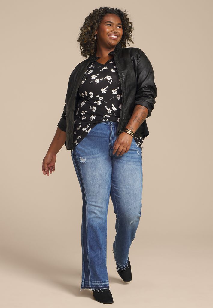 Plus Size 24/7 Mesh Trim Floral V Neck Tee