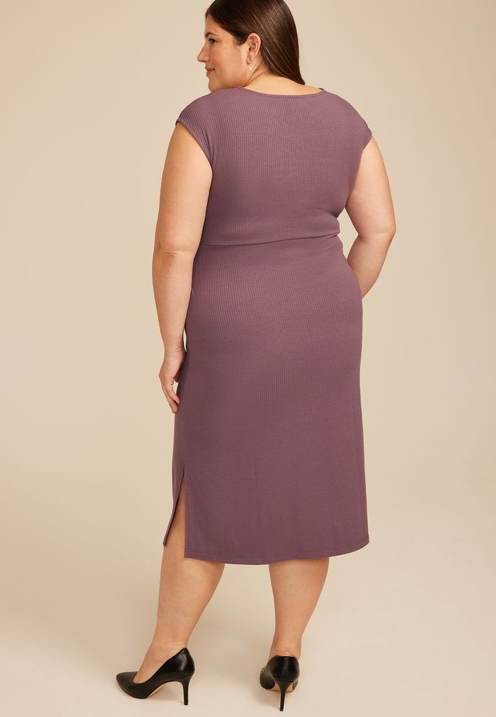Designed for every moment, this ribbed knit midi dress blends effortless elegance with modern versatility. The wrap-inspired bodice creates a flattering twist detail that accentuates the waist, while the sleek silhouette moves with ease from day to night. A timeless piece that feels as good as it looks—perfect for workdays, weekends, and everything in between.