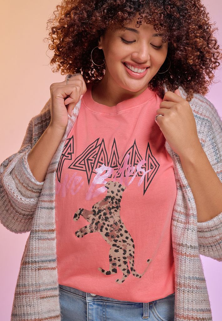 - “Love Bites Def Leppard”leopard illustration with a spotted pattern graphic