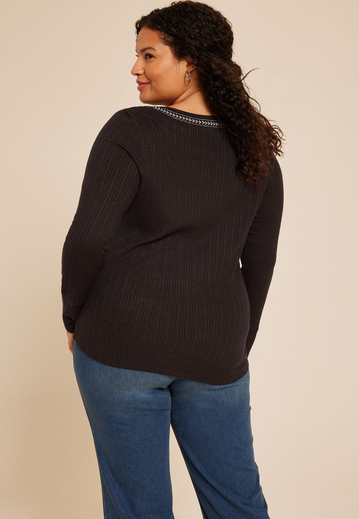 Plus Size Embroidered Notch Neck Ribbed Long Sleeve Tee