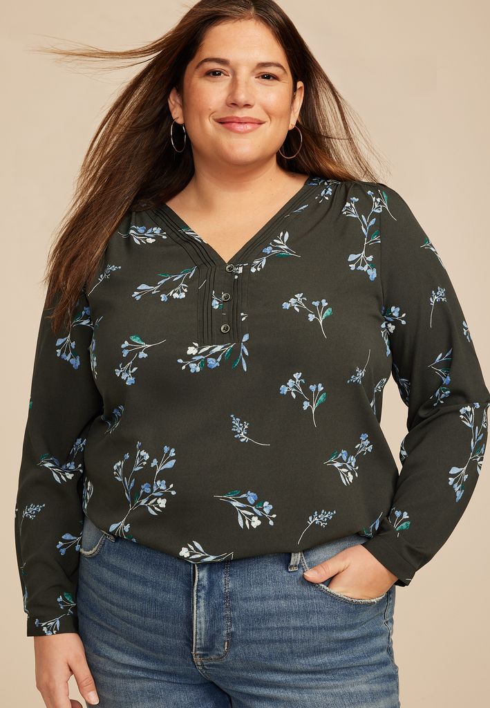 Plus Size Floral Pleated V Neck Button Front Blouse