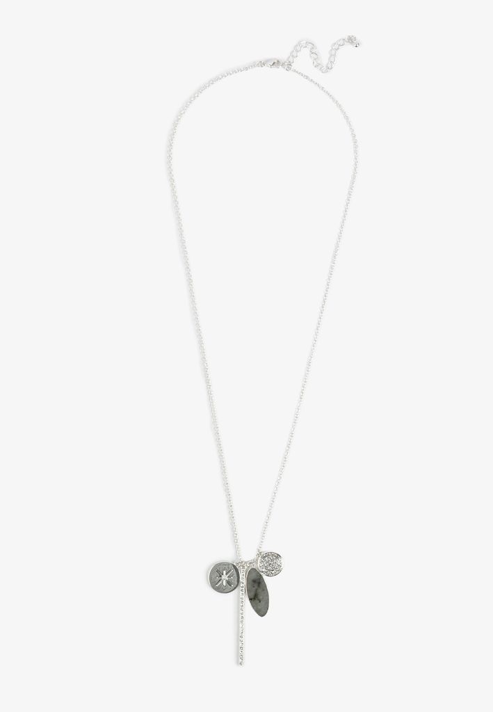 - small round charm with pave crystals, vertical bar with rhinestones, oval gray stone charm, round disc with starburst engraving