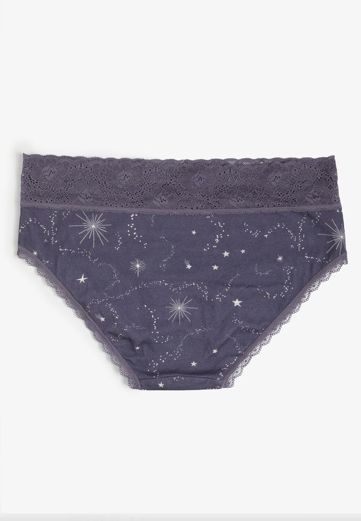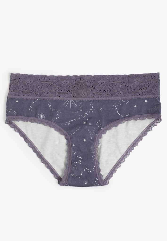 Our soft cotton hipster provides all day comfort! The secret ingredient is its stretchy lace waistband that holds the panty in place without digging in. It has a medium rise with moderate coverage.