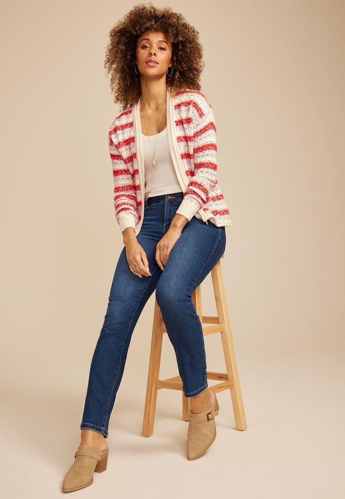 Add a pop of color with a whisper of romance. This open-front cardigan combines bold red stripes softened by a hint of lavender for a look that feels playful yet elegant. Lightweight and easy to style, it’s the perfect piece to brighten your everyday layers with a touch of charm. Style it over a white tee with jeans for casual charm, or pair with a blush camisole and slim trousers for a romantic vibe. For weekend coziness, layer with a turtleneck and ankle boots, or throw over a satin slip dress for a chic Valentine’s touch.