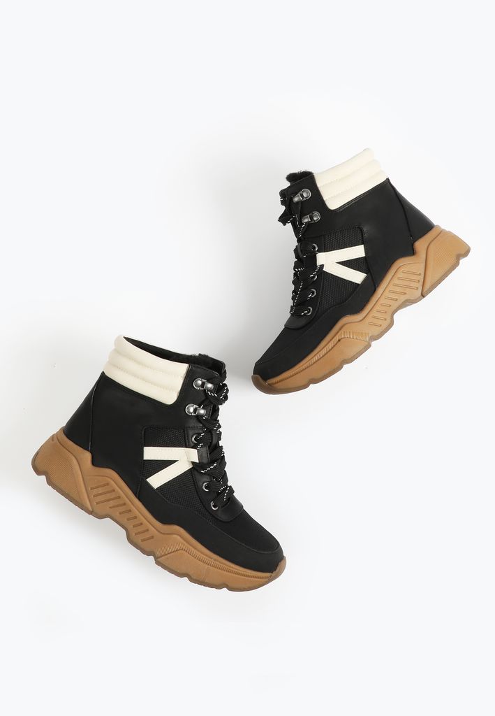 • functional laces with black and white patterned laces and metal eyelets/hooks