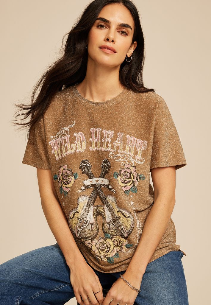 - featuring “Wild Heart” two crossed guitars with floral accents and a glittery finish graphic