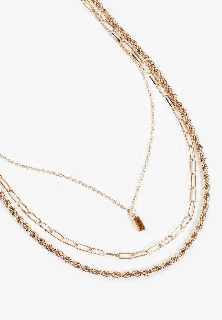 - featuring: thin cable chain with a small rectangular brown gemstone pendant, elongated paperclip-style link chain, twisted rope chain