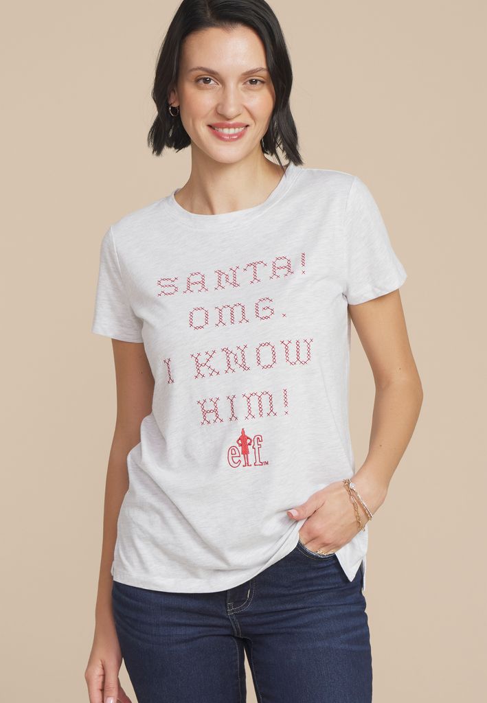 - licensed elf “SANTA! OMG. I KNOW HIM!” red cross stitch style lettering reads graphic
