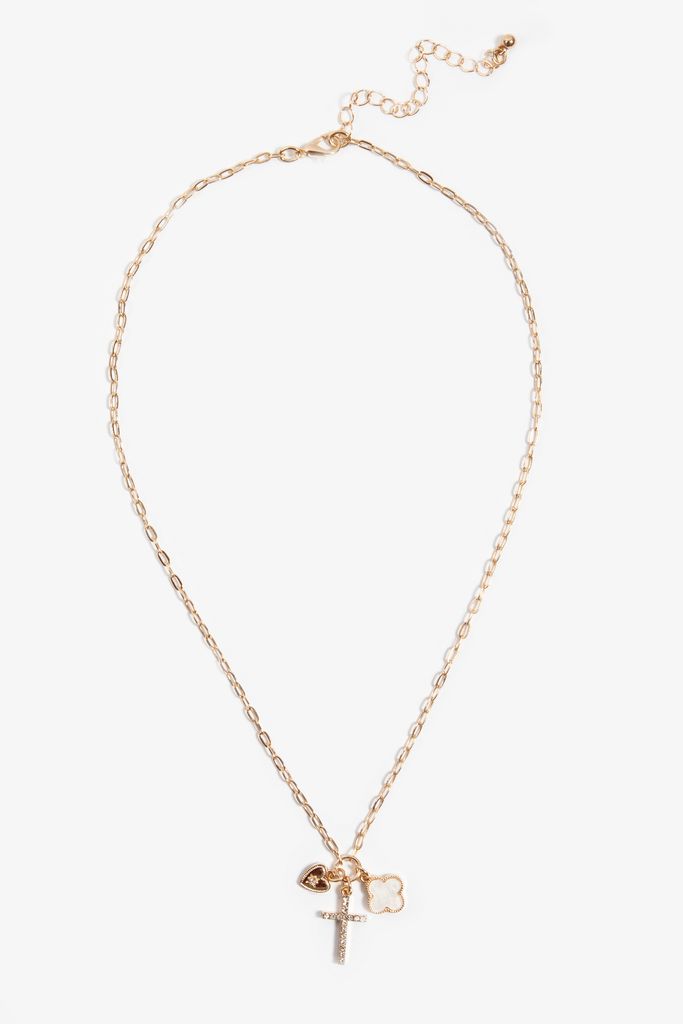 • cross charm with rhinestone accents, heart charm with rhinestone detail, clover charm with white enamel finish
