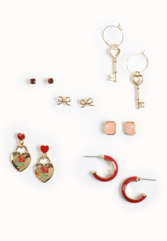 • features: mixed earring set offering six unique pairs for versatile styling, includes heart key hoops, rose heart drops, red enamel mini hoops,dark red crystal studs, gold bow studs, and soft blush gem studs