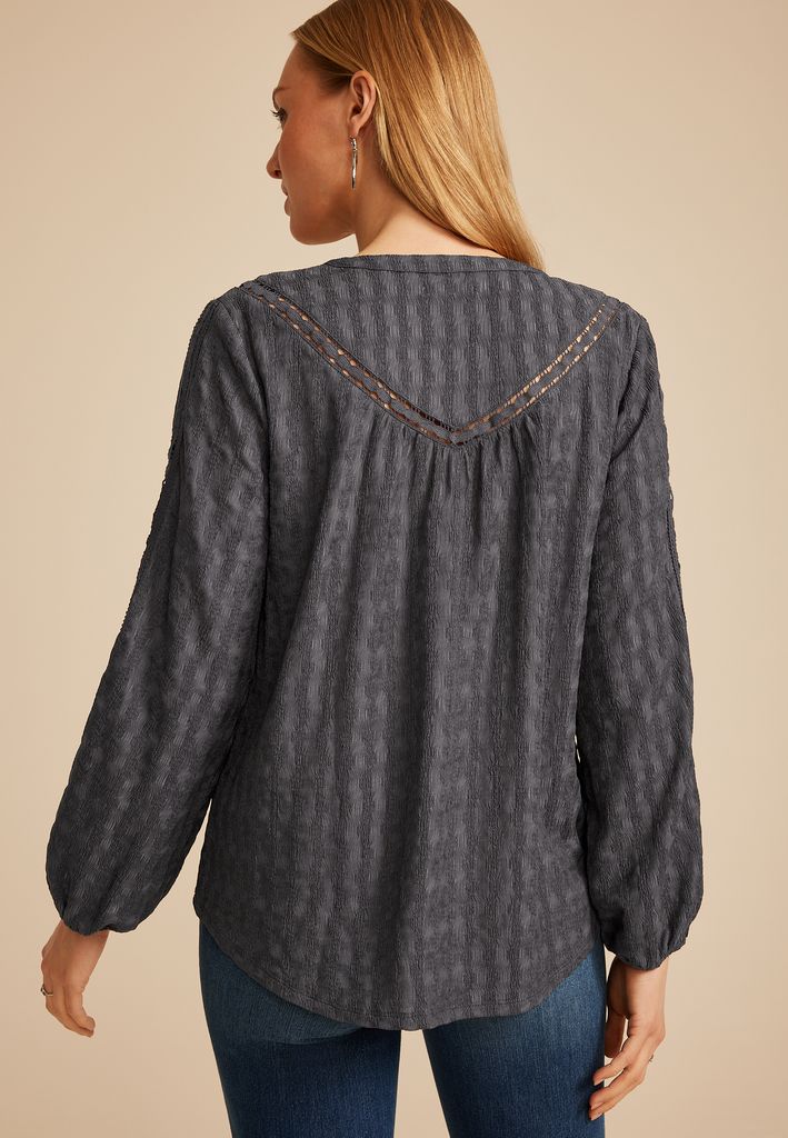 • decorative ladder stitch trim along the neckline, sleeves and upper back for added detail