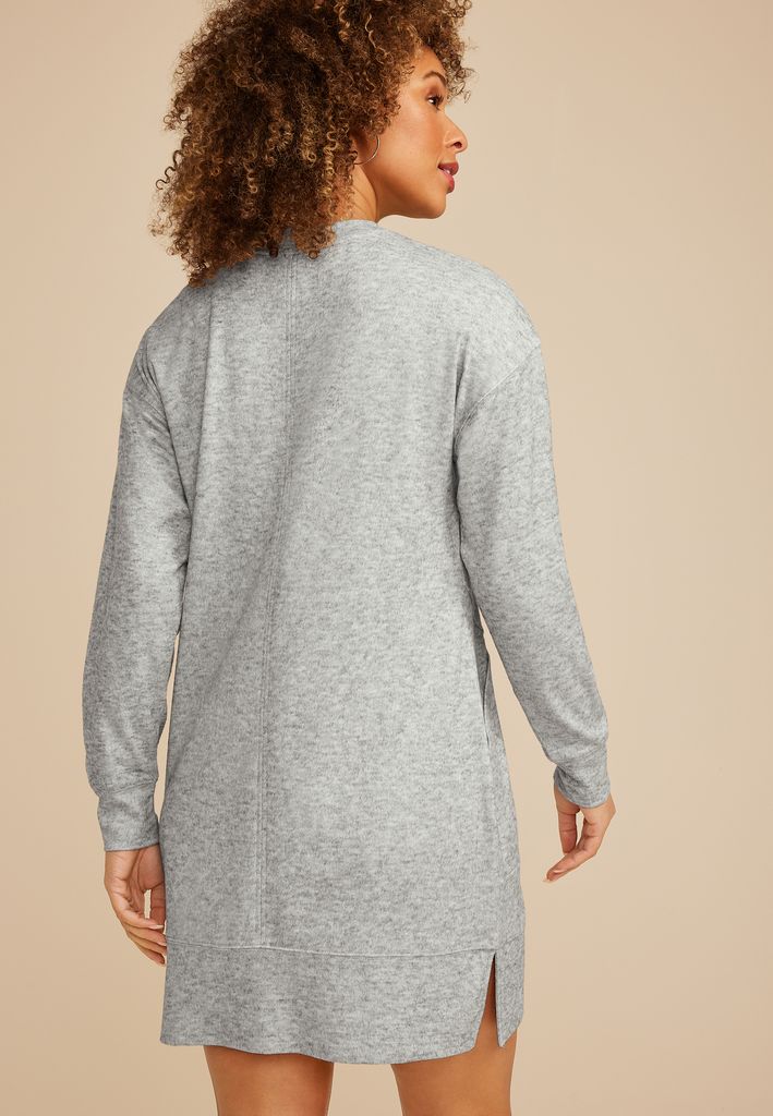 Simplicity meets sophistication in this cozy sweatshirt dress. Crafted in soft heather gray, its relaxed silhouette and classic crew neckline create an effortlessly chic look. Long sleeves and subtle side slits add comfort and movement, while the handy pockets make it as practical as it is stylish. Perfect for lounging at home or stepping out for a casual day—this dress is your go-to for understated elegance.