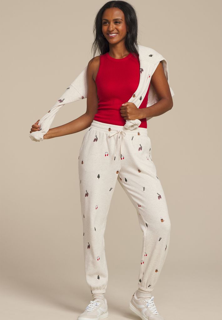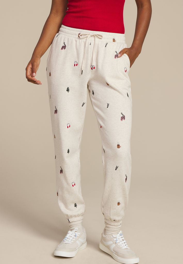 - all over evergreen trees, mittens, earmuffs, hot beverage mugs and ski poles embroidery