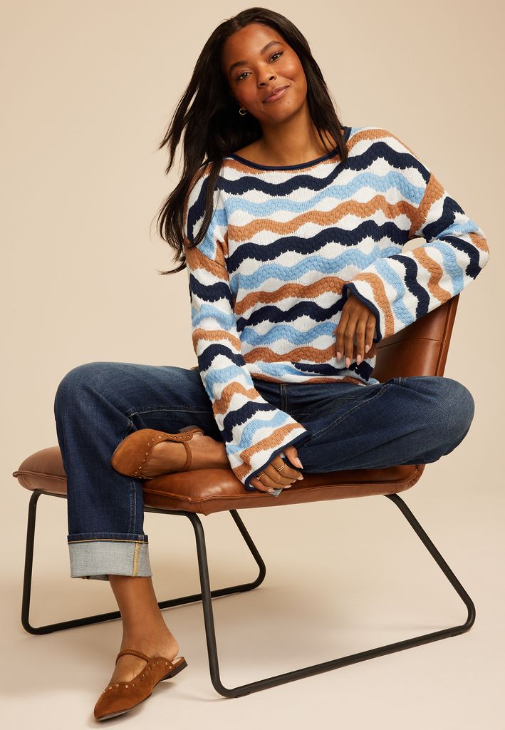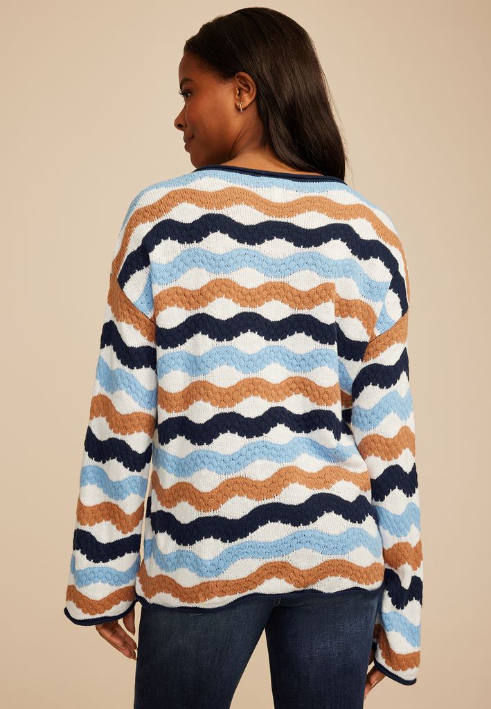 This sweater brings a breezy, feel‑good ease to your day. Soft wave stripes in calming blues and warm neutrals create an effortless, uplifting look. Its relaxed drape and cozy texture make it the piece you reach for when you want comfort that still feels fresh and full of charm. It adds a touch of laid‑back brightness to any moment, giving your everyday style a soft sense of movement and ease. Pair it with medium‑wash denim for an easy everyday look, layer a navy or camel coat to highlight the stripe colors, or slip into white sneakers for a clean casual vibe.