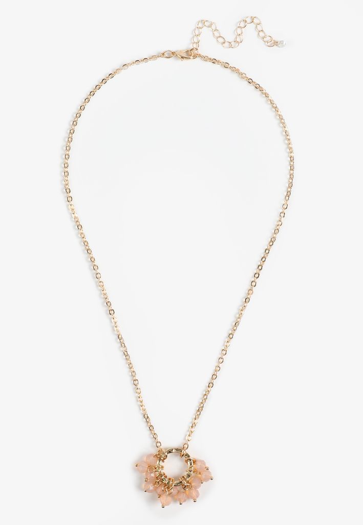 - featuring: open circular pendant with clustered pink beads