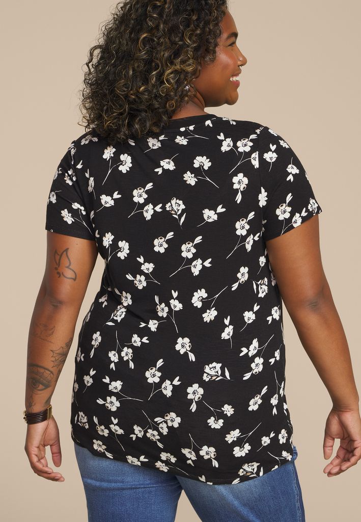 Plus Size 24/7 Mesh Trim Floral V Neck Tee