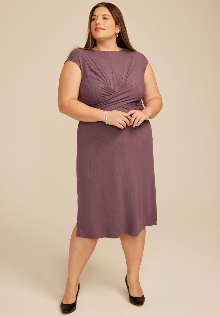 Designed for every moment, this ribbed knit midi dress blends effortless elegance with modern versatility. The wrap-inspired bodice creates a flattering twist detail that accentuates the waist, while the sleek silhouette moves with ease from day to night. A timeless piece that feels as good as it looks—perfect for workdays, weekends, and everything in between.