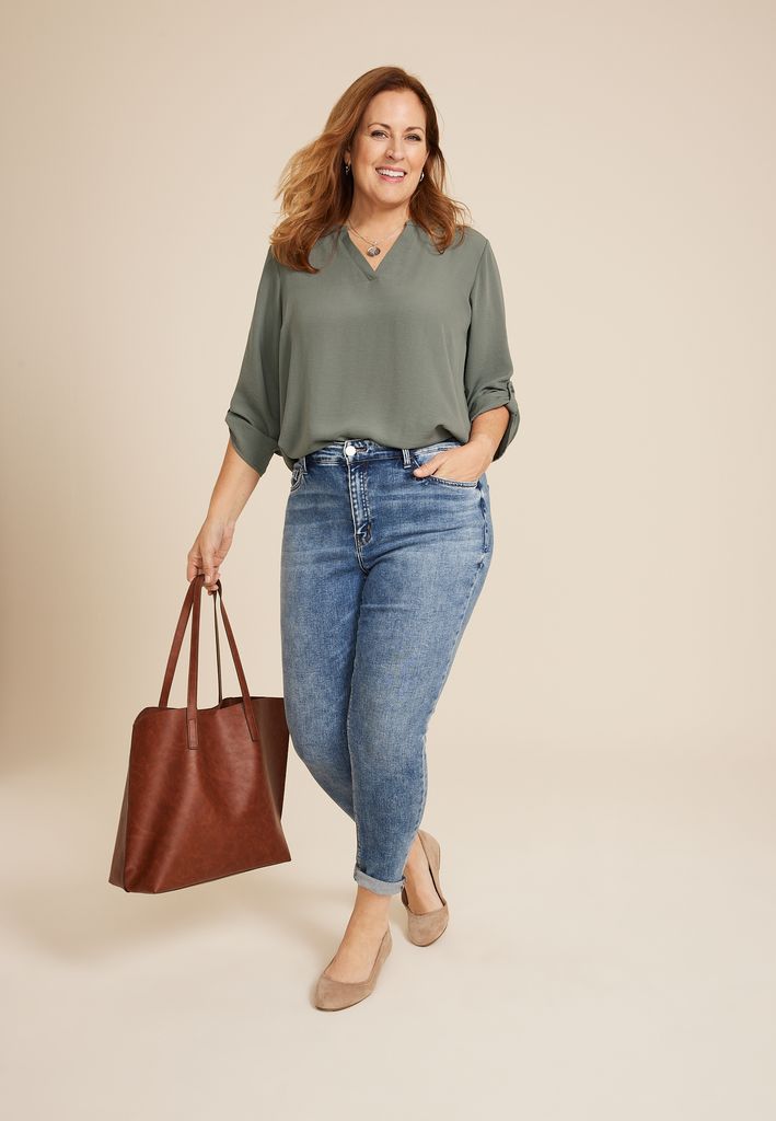 To compliment this fashionable top, add one or both of our Atwood necklaces to your cart to complete the look! Shop 121128 and 123670