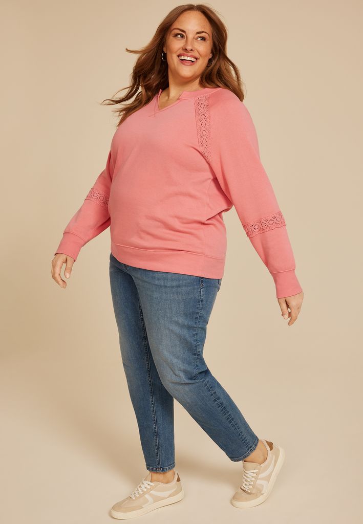 - delicate lace insets along the shoulders and lace band detail around the lower sleeve