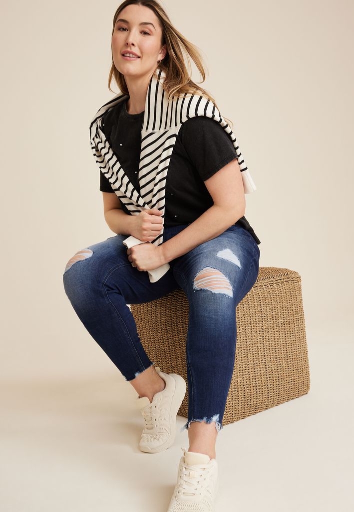 - curvy fit: designed to flatter with more room in the hip and thigh and eliminates waist gapping.