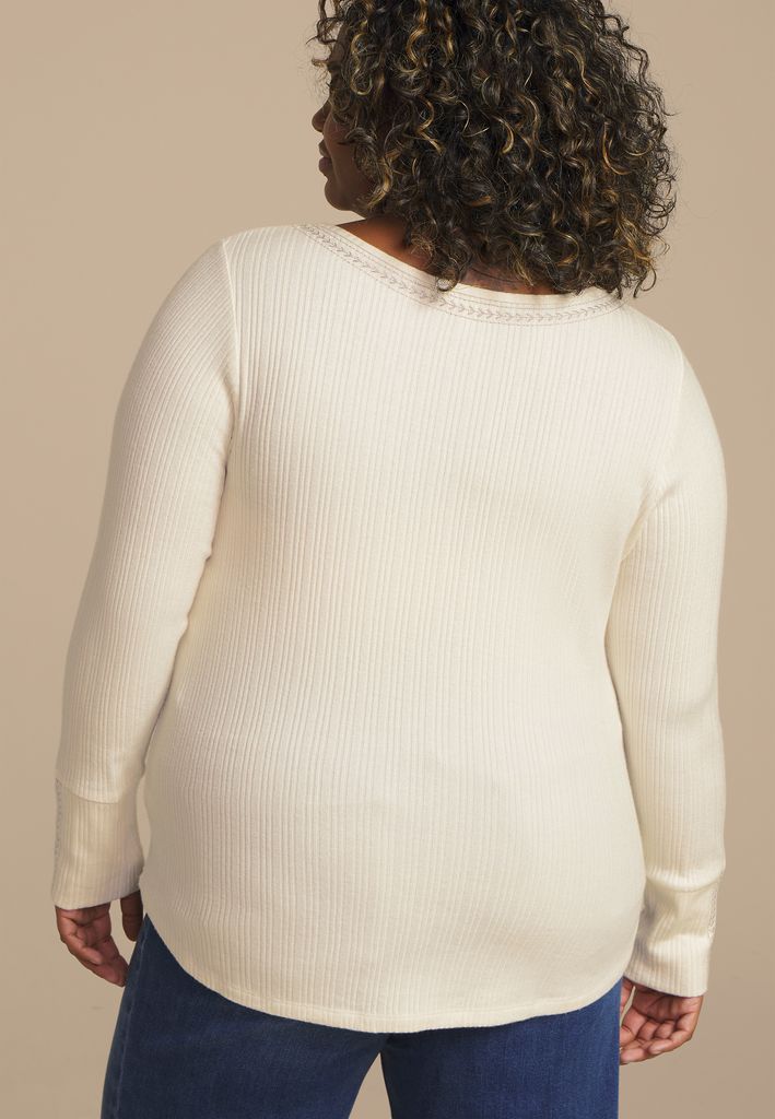 Plus Size Embroidered Notch Neck Ribbed Long Sleeve Tee