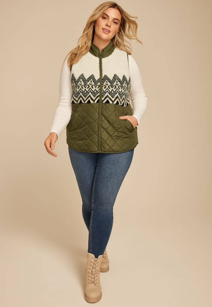 - Upper: white sherpa fleece with fair Isle pattern in black and green; Lower: olive green quilted fabric