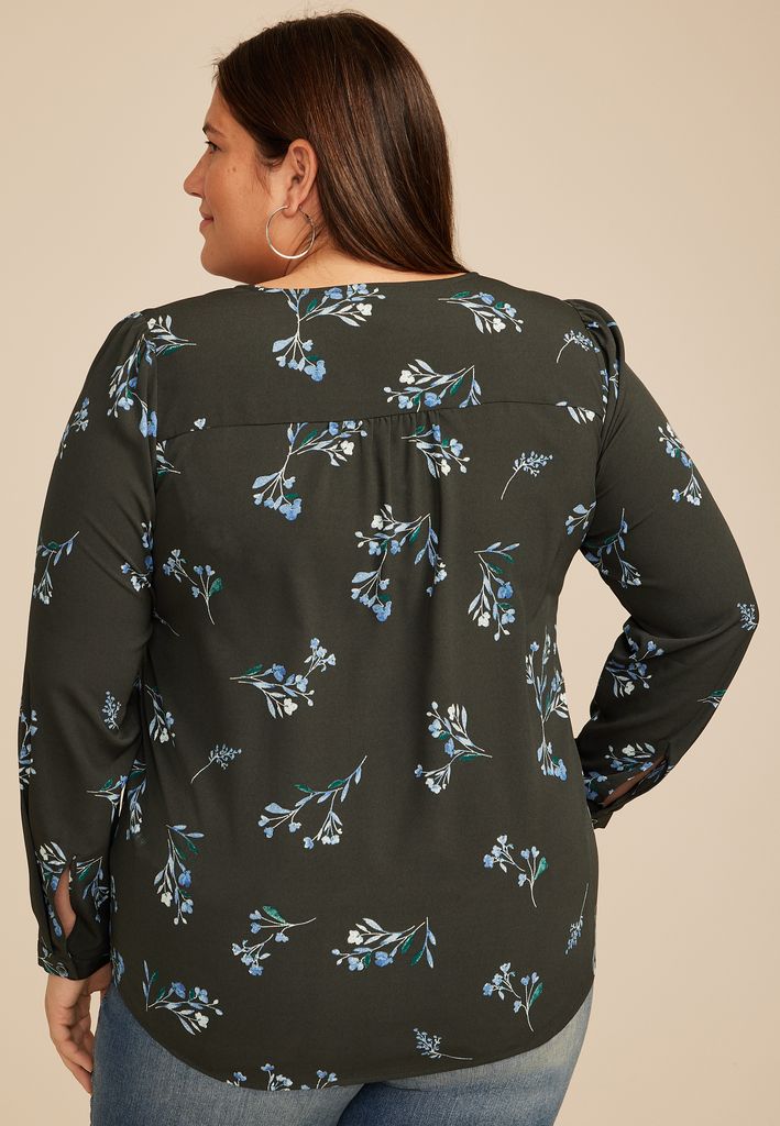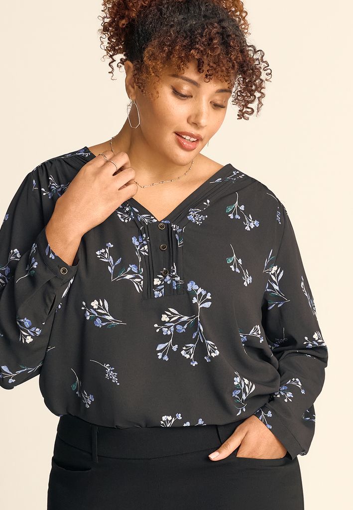 Plus Size Floral Pleated V Neck Button Front Blouse