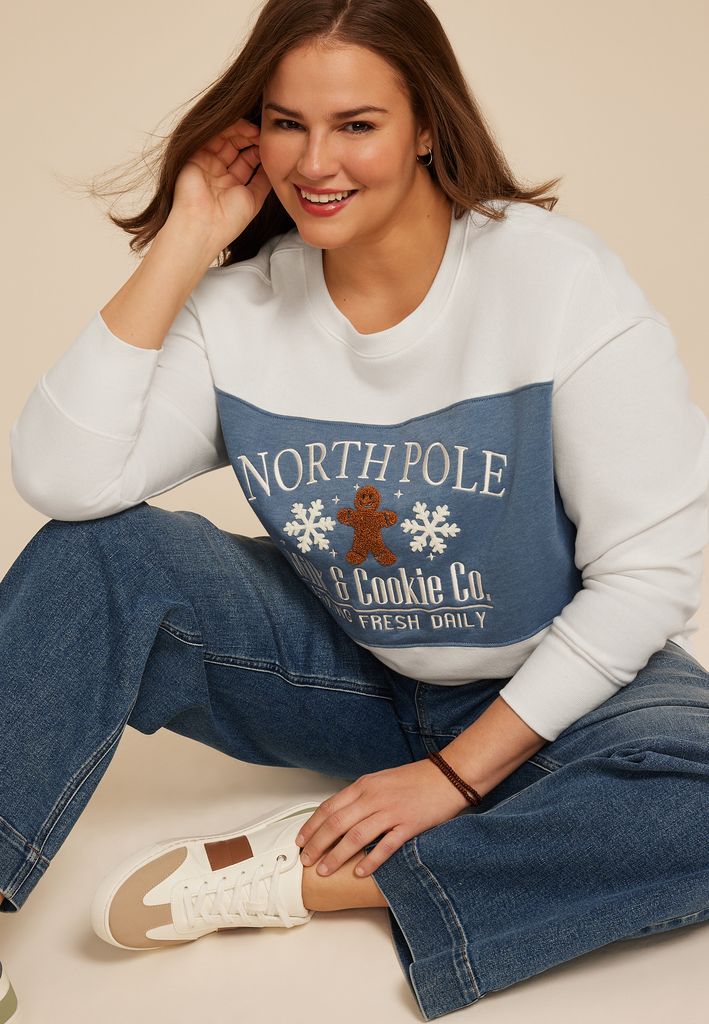 - “North Pole Milk & Cookie Co. Holiday” Baking Fresh Daily embroidered letters with gingerbread graphic