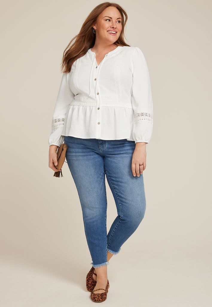 Plus Size Soft White Crochet Trim Tie Front Peplum Top