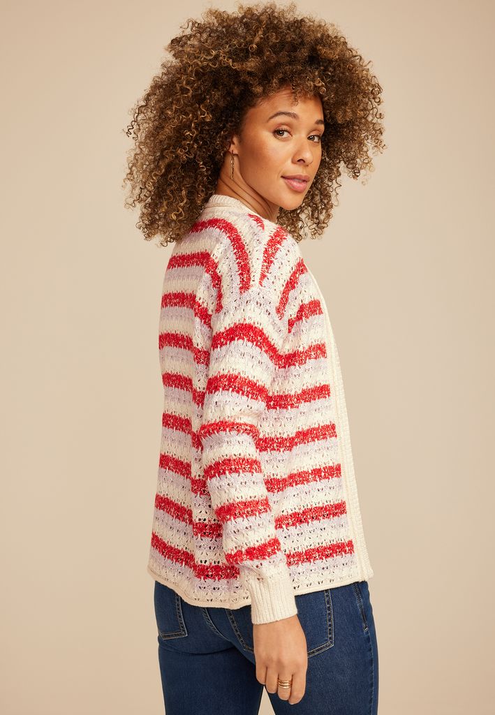 Add a pop of color with a whisper of romance. This open-front cardigan combines bold red stripes softened by a hint of lavender for a look that feels playful yet elegant. Lightweight and easy to style, it’s the perfect piece to brighten your everyday layers with a touch of charm. Style it over a white tee with jeans for casual charm, or pair with a blush camisole and slim trousers for a romantic vibe. For weekend coziness, layer with a turtleneck and ankle boots, or throw over a satin slip dress for a chic Valentine’s touch.